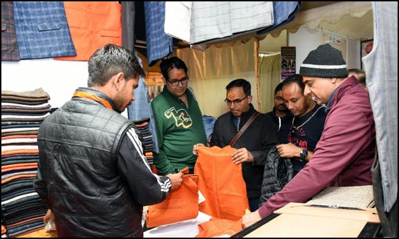 Close-up view of shoppers examining textiles at a shop in the Khadi Utsav.
